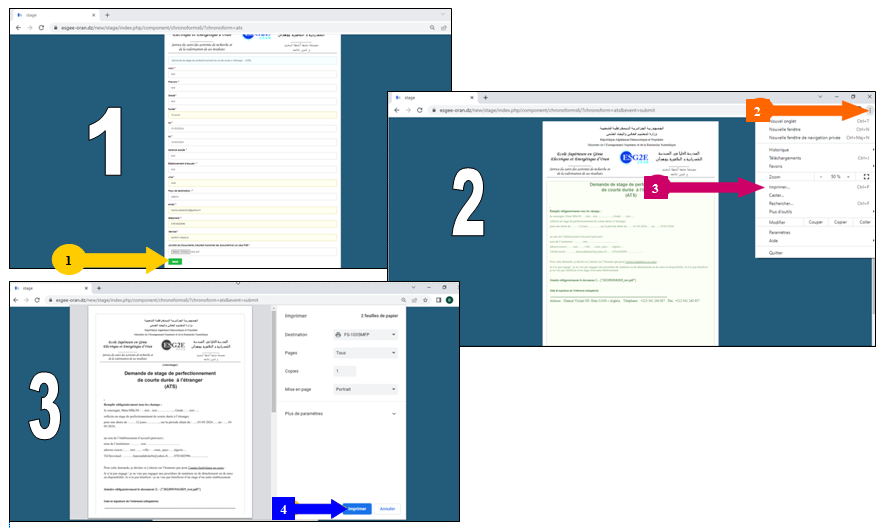 Pour les Séjours Scientifiques de Haut Niveau à l’étranger (SSHN) : Professeurs, maîtres de conférences« A » et Maîtres de Conférences « B »,, peuvent bénéficier d’un séjour scientifique de haut niveau (SSHN) d’une durée de 07 a 15 jours au plus. ils doivent pour cela justifier : Au retour de formation : Le bénéficiaire devra remettre dans un délai de sept jours (07) : Dernier délais le 08/03/2025 à minuit Pour les stages de perfectionnement de courte durée (SPCD) au profit des Maîtres-assistants et des doctorants non-salariés : Les demandeurs suscités peuvent bénéficier d’un stage de perfectionnement d’une durée allant de 15 à 30 jours au plus, et doivent justifier de: Au retour de formation : Le bénéficiaire devra remettre dans un délai de sept jours (07) : Demande de stage de perfectionnement de courte durée à l’étranger (MAA) Pour les demandes de manifestations scientifiques (MS)d’une durée n’exédant pas 07 jours (ex : congé scientifique): Sont concernés les doctorants non-salariés, les maîtres assistants MAA, MCB, MCA et les Professeurs : Au retour de formation : Le bénéficiaire devra remettre dans un délai de sept jours (07) : Pour les demandes de stage de cours durée (SCD) au profit des ATS : Les personnels administratifs et techniques ayant au minimum un diplôme universitaire et la catégorie (10) et plus, peuvent bénéficier d’un seul stage de perfectionnement de courte durée (SCD) d’une durée variant de 7 à 10 jours. Ils doivent pour cela justifier : Au retour de formation : Le bénéficiaire devra remettre dans un délai de sept jours (07) : Dernier délais le 08/03/2025 à minuit Demande de stage de perfectionnement de courte durée à l’étranger يتم اختيار المؤسسة الجامعية المستقبلة في اطار اتفاقيات التعاون الدولي المبرمة من طرف المدرسة لا يسمح بالحركية قصيرة المدى في الخارج،من الصنف الببليوغرافي ،إلا فيما يخص المراكز الوثائقية و قواعد البيانات المتخصصة(مراكز التوثيق و المحفوظات المتخصصة)في المجالات التي تبقى تغطيتها ضئيلة جدا على المستوى الوطني،طبقا للمادة 2 من هذا القرار.